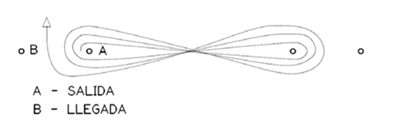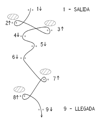 • Des del punt de sortida es propulsa l’embarcació per arribar a la porta número 1 amb velocitat. En passar per la porta 1 s’activa el cronòmetre, es fa el pas per la porta 2 i es retorna a la porta fent una trajectòria en forma de 8.