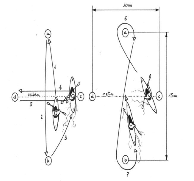 Des de la posició de sortida en el centre del rombe, cal fer, de forma contínua i respectant l’ordre establert, els palejos següents: